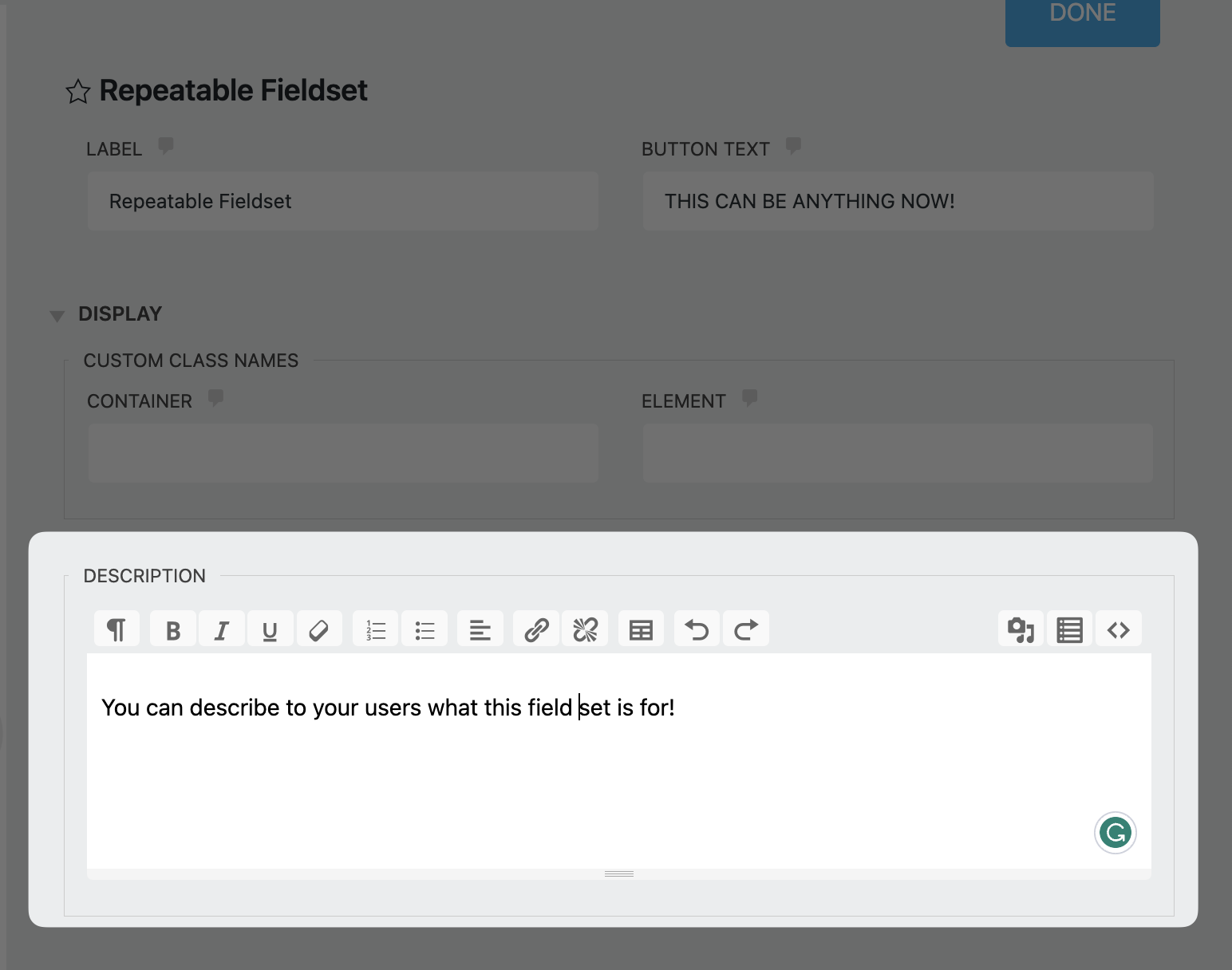 Click on the Repeatable Fieldset gear icon to open the field, and look for the Display dropdown. There you will find the description field where you can customize the repeatable section helping users understand what they need to do.