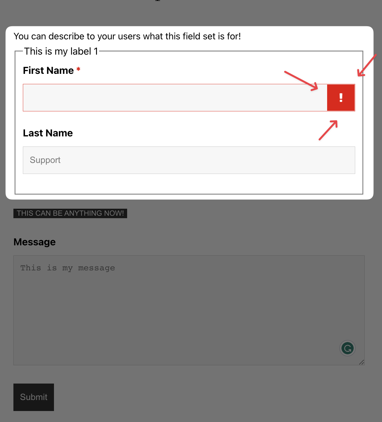 Now, errors made within repeatable sections will be caught and shown to the user, making it easier to correct entries. Note that validation currently only works for fields inside the Repeatable Fieldset.