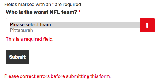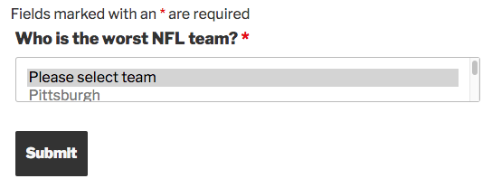 With the field set to Required, any list option not containing a Value will not pass validation. In plain English, that means if a user doesn’t pick an actual option, the form won’t submit. Instead, it will prompt them to make a selection: