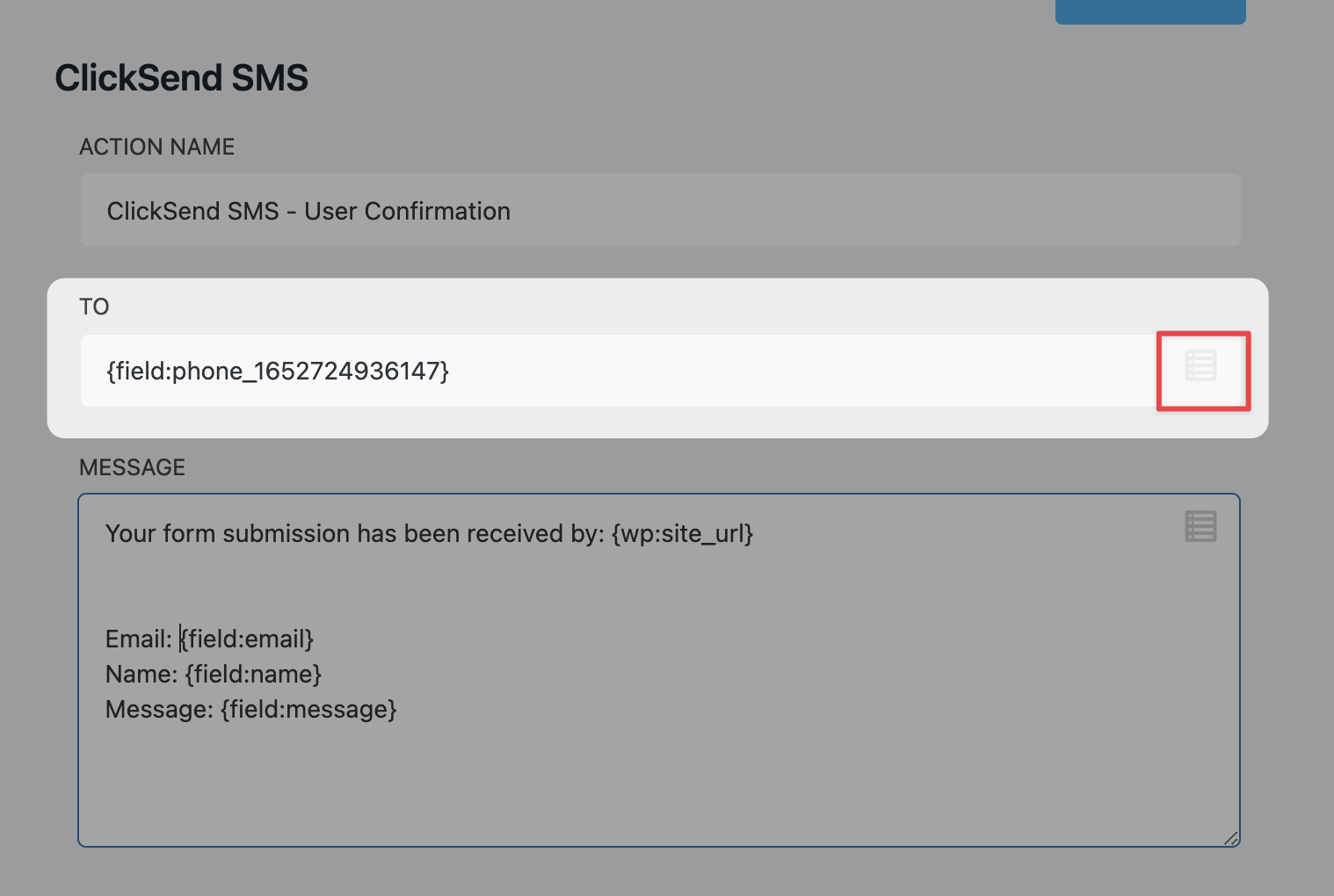 To send users a submission confirmation via text message add the ClickSend action to your form. Next, add your user’s phone number to the “To” field using the merge tag selector.
