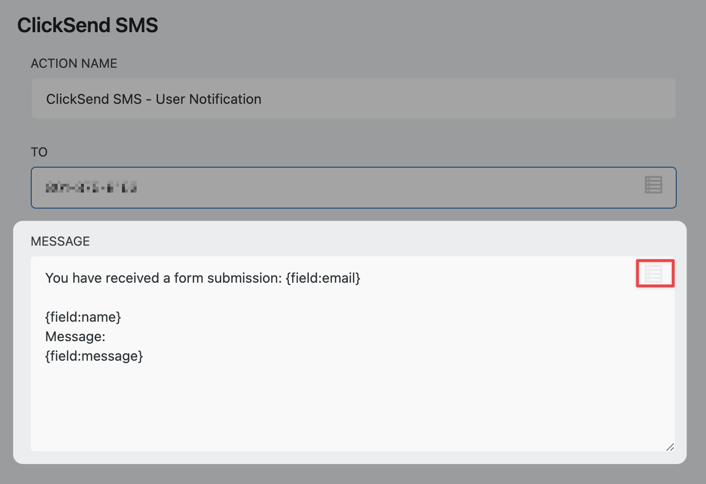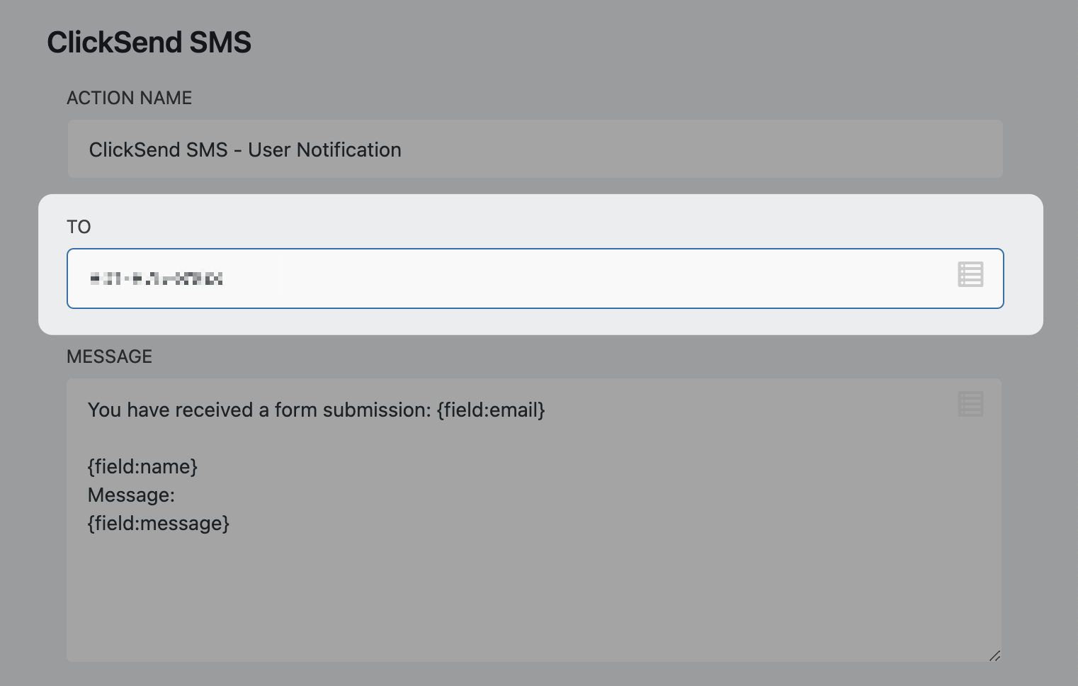 To receive notifications via text message add the ClickSend action to your form. Next, add your phone number to the ‘To‘ field using the merge tag selector.