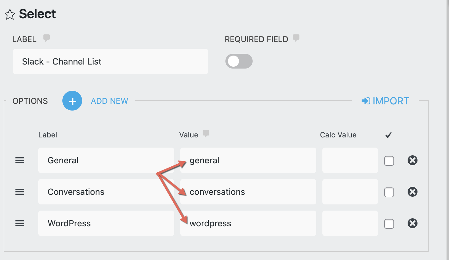 Add the desired field to your form. Add a label and value to each option that corresponds with the Slack channel you want their submission to be associated with.