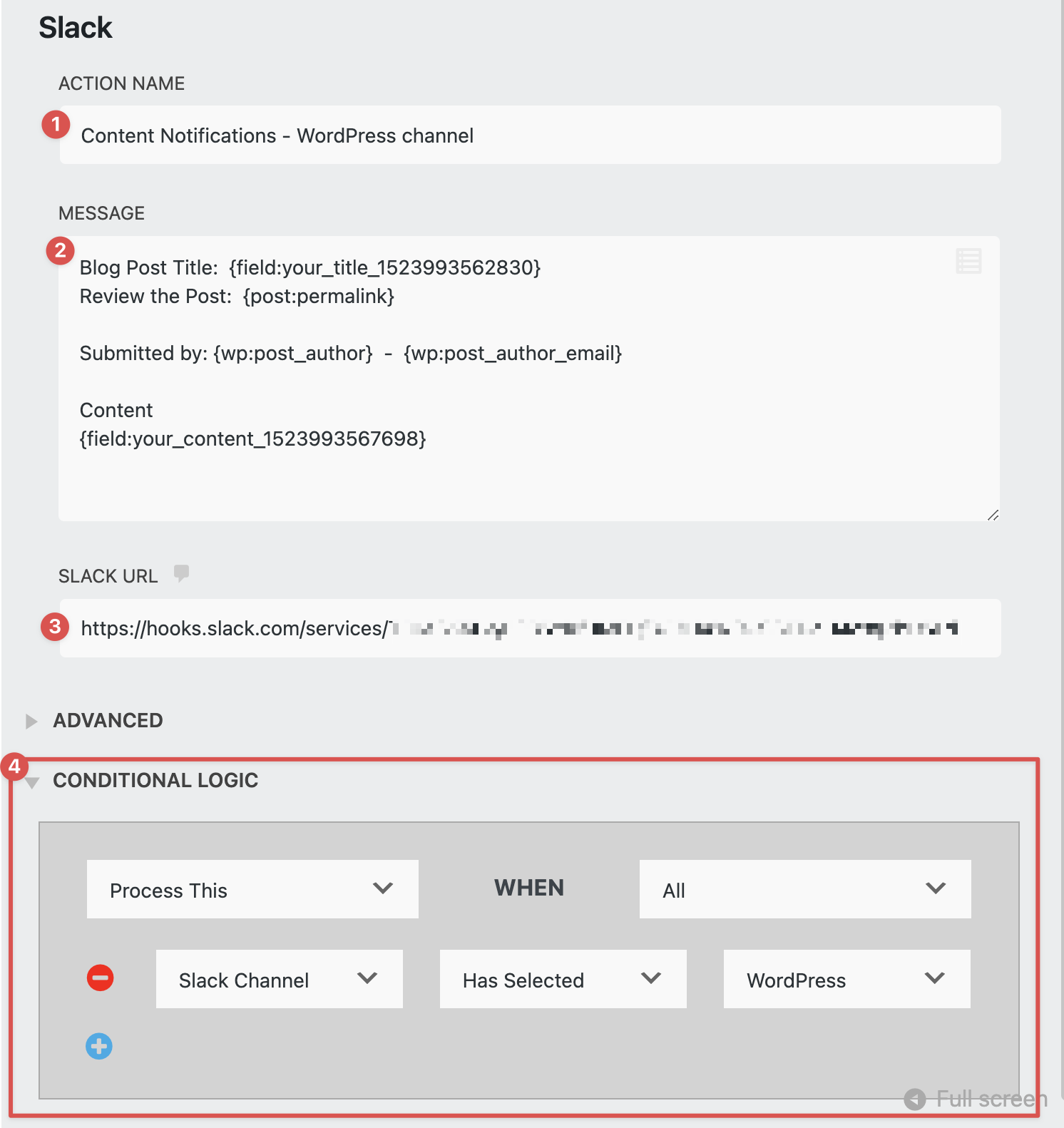 Set the trigger condition based on the channel associated with the webhook. Open the Conditional Logic settings found in the action. This will help you determine which Slack channel you want the notification to go to.