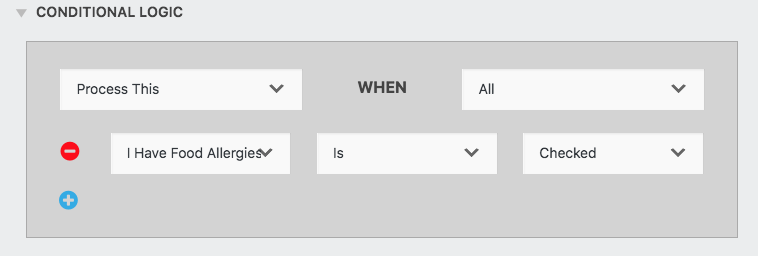 Have a dinner event you’re registering attendees for? Maybe you want to send additional information to individuals who indicate they have food allergies. Whip up an email action specifically for these individuals. In the action settings, expand the Conditional Logic settings, select the field where you ask about food allergies. Set the action to fire only if that field is checked: