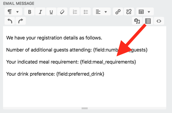 Place your mouse wherever in the email message you want the field information to appear. Click the merge tag icon at the base of the arrow. Select the field merge tag from the list. Rinse repeat.