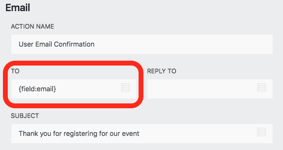 In every new email action with a pre-built form, that’s already set up for you. As is, that will send the email to the address the user enters into the form’s email field. If you’ve deleted that field and then added another, be sure to change this. Just use the hamburger icon on the right to reselect the email field.
