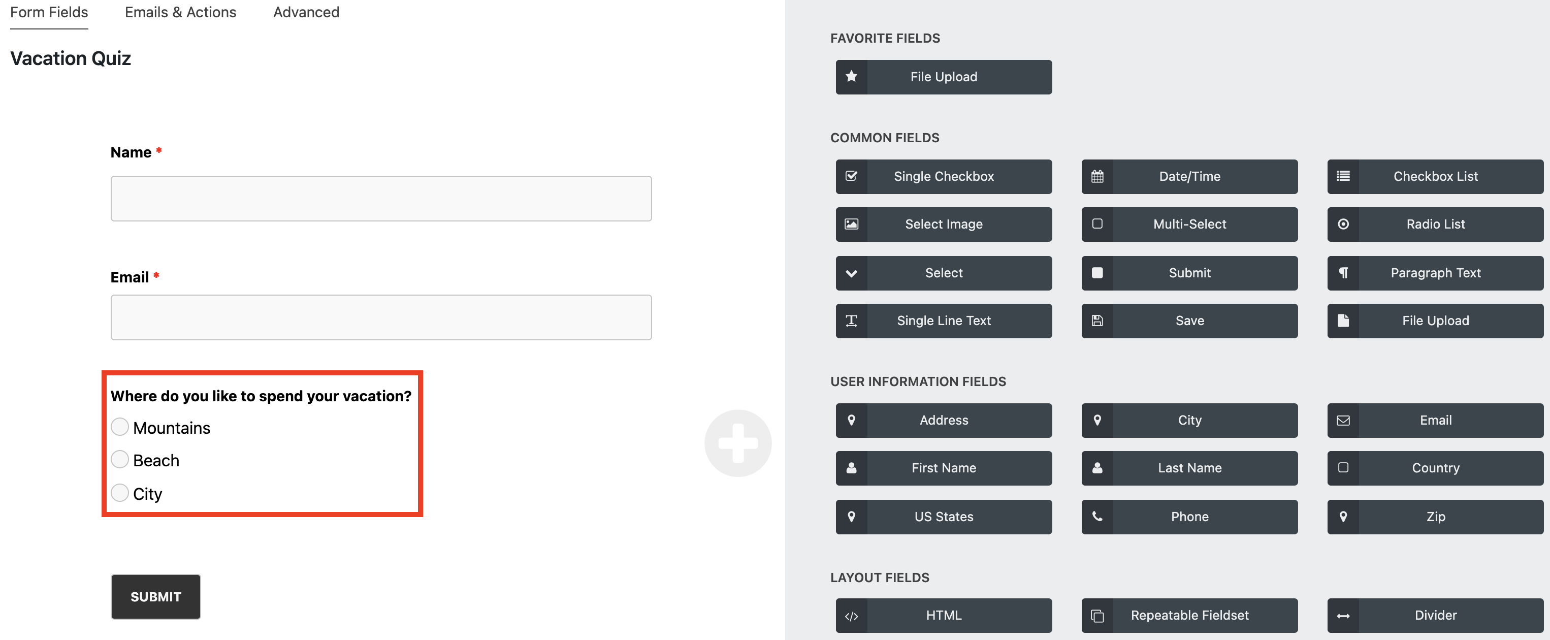 Let’s say you are making a quiz asking users what is their preferred vacation spot. First, you set up a radio list to give them options between the mountains, beach, and city. Depending on the options you defined in your form and which option your users choose, you can send them to the page of their interest.