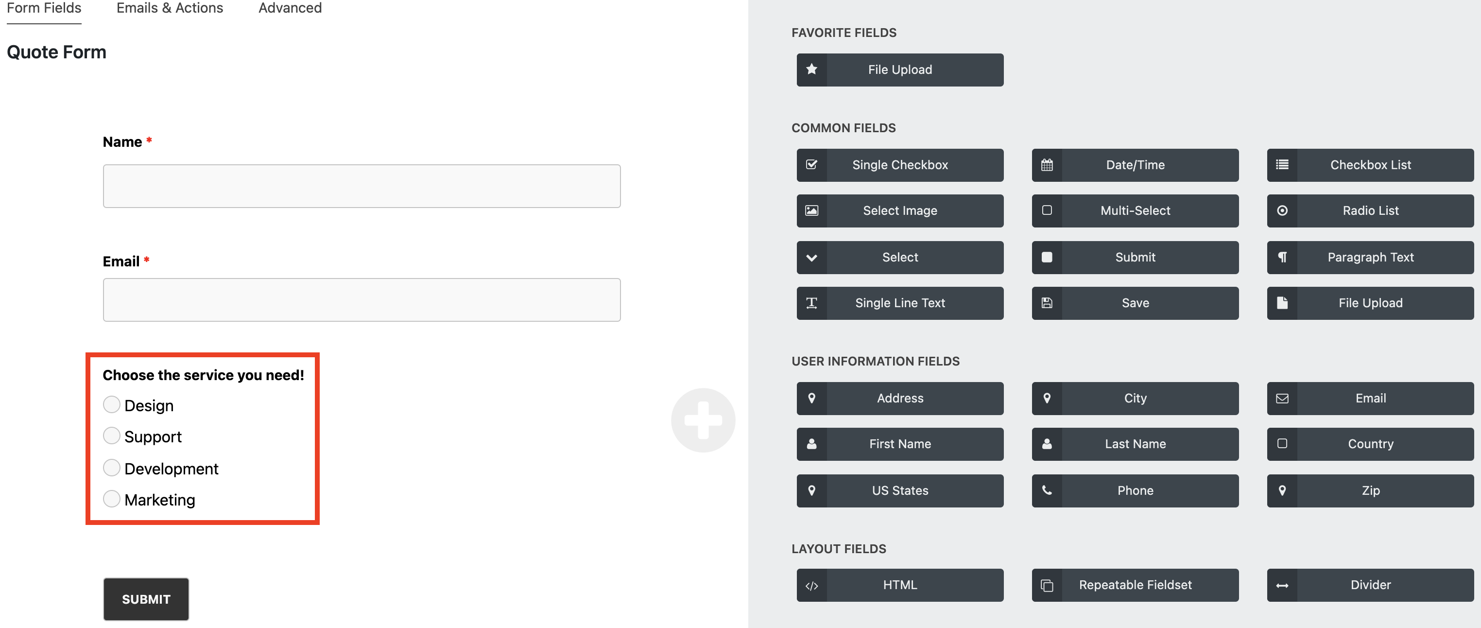 In our form, we are asking the user to choose the service from 4 options. We use the Radio list field type where each option represents the department. Based on which option the user selects, the right department will be notified by email.