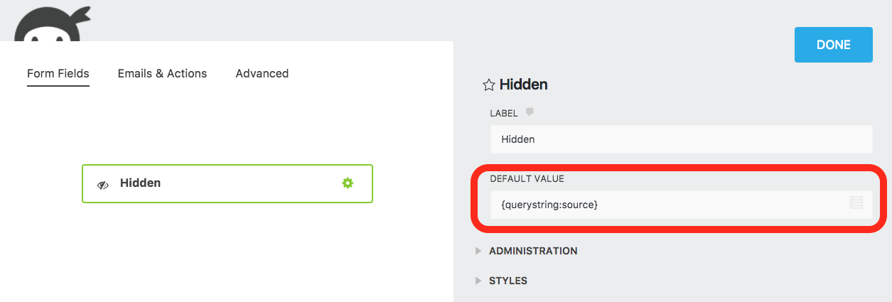 - Place a hidden field onto your form and set its default value as {querystring:source}, where “source” is the key you chose to use in the first step.