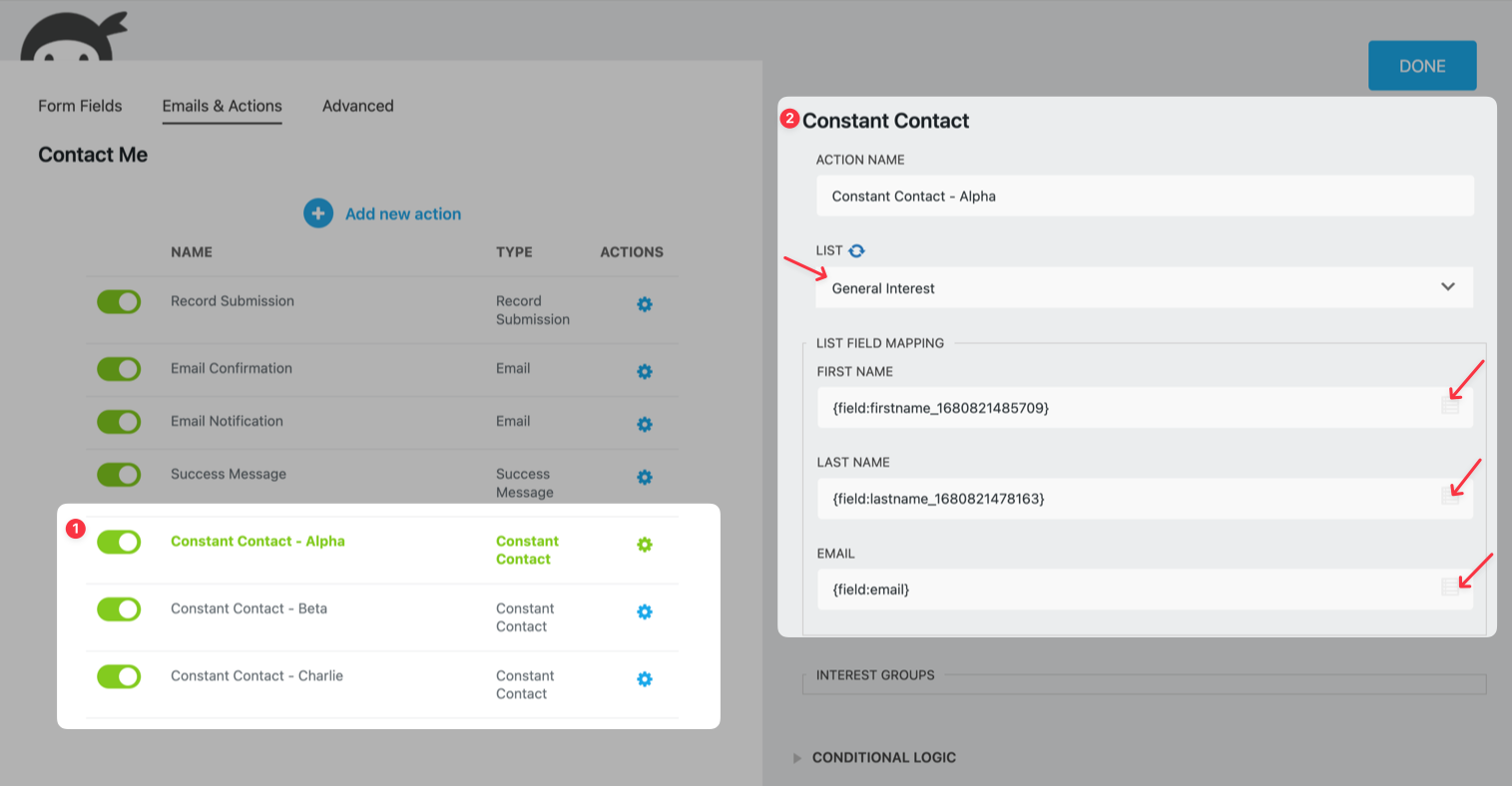 Click on Emails & Actions and add a Constant Contact action for each list available. Name the actions according to their corresponding lists. Open each Constant Contact action and map the form fields to their respective Constant Contact fields.