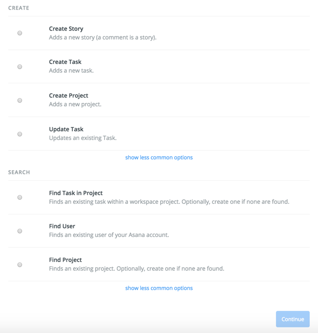Setting up your Action App is very similar to the Trigger App we setup above. Search and select Asana the same way we did Ninja Forms in the previous step. Once selected, you’ll be presented with a number of options for the specific action you want to be performed:
