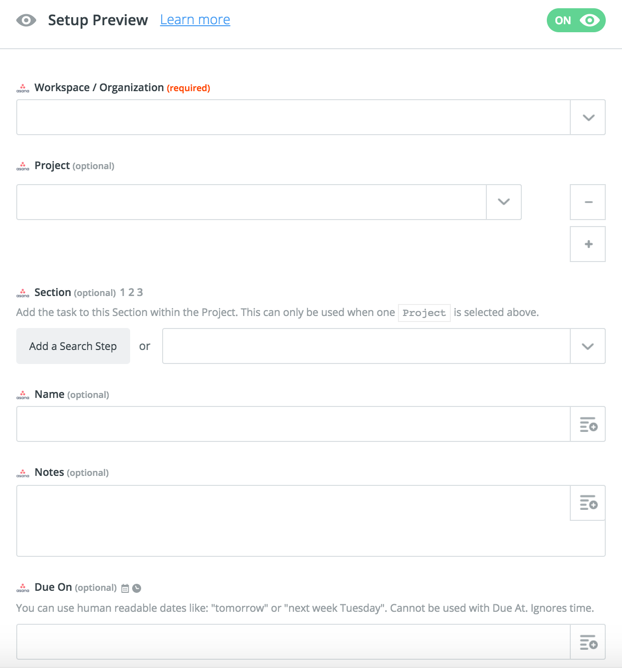 Next, you’ll edit and customize the template to meet your specific requirements. For this demonstration we’ll use the Create Task action as an example, though the same principles apply all Asana actions.