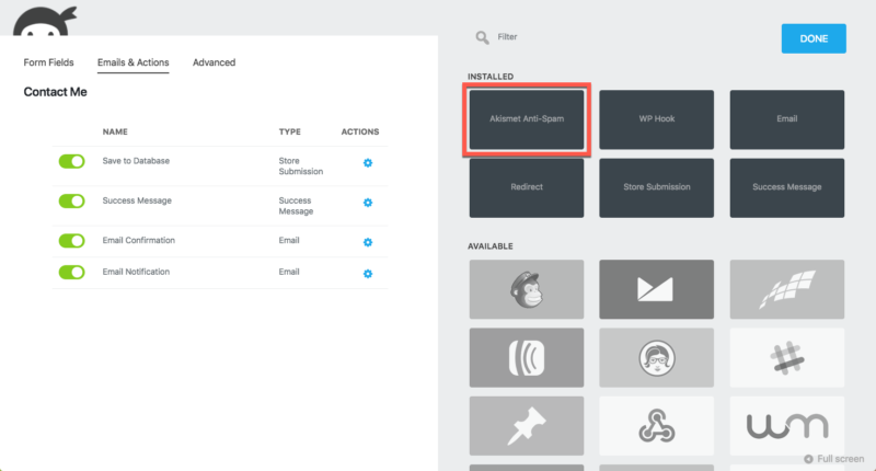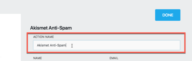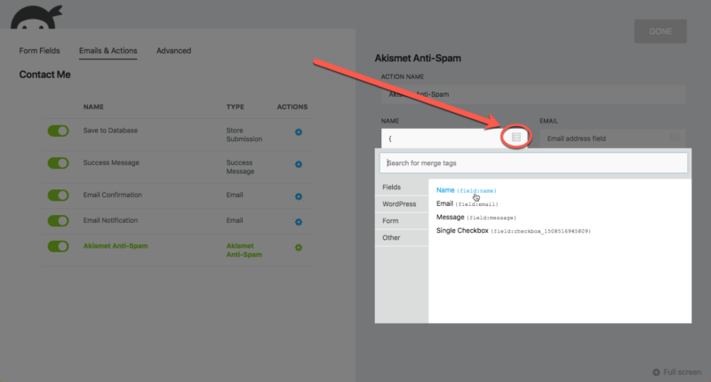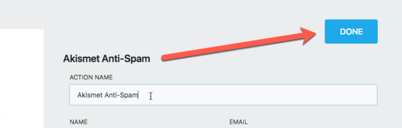 Upon editing the action you can utilize the merge tag feature to assign Akismet to monitor chosen fields for email spam. You can merge Name, Email, URL, and Message to Akismet monitoring.
