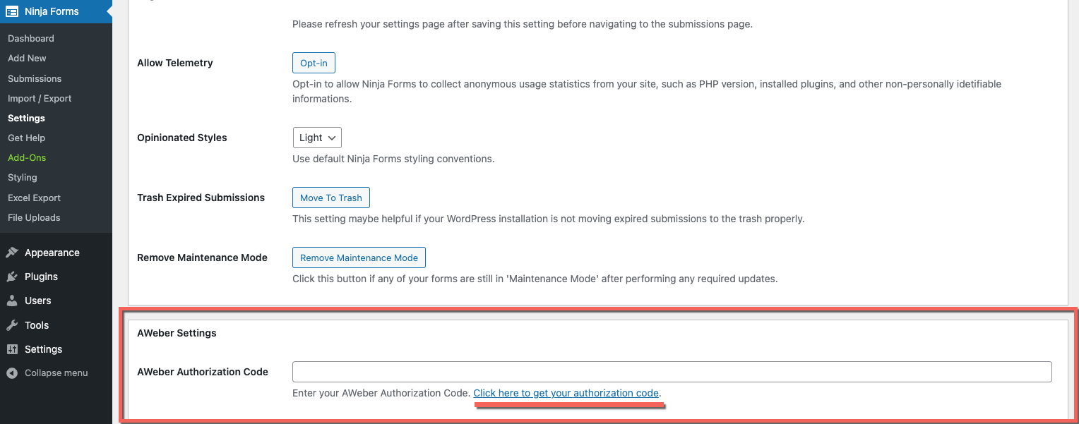 The extension needs your permission to access your AWeber account, view your lists, and add new users to those lists. In the WordPress admin you should navigate to Ninja Forms > Settings and find the AWeber Settings box.