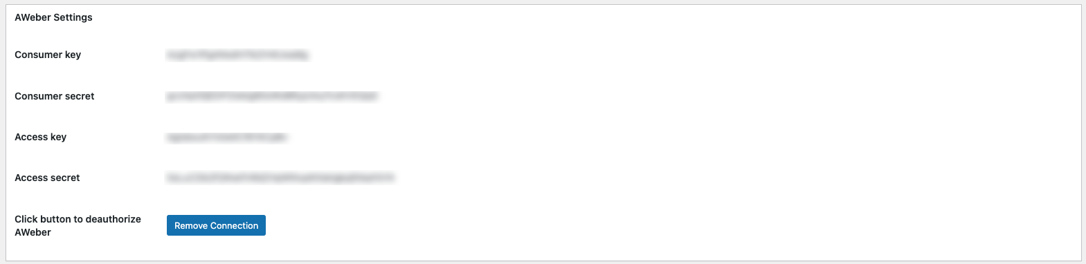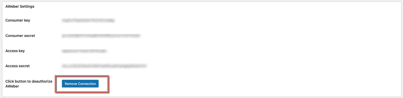 If for some reason you wish to remove the extension’s access to your AWeber account you simply revisit the Forms > Settings > AWeber Settings page and click on the “Remove Connection” button.