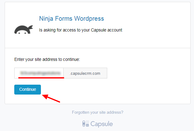 You will be sent to Capsule and asked to enter your Capsule account subdomain and click Continue.