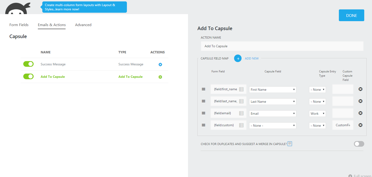The Capsule CRM extension for Ninja Forms enables you to send your form submission data directly into your Capsule CRM account. Supported modules are: