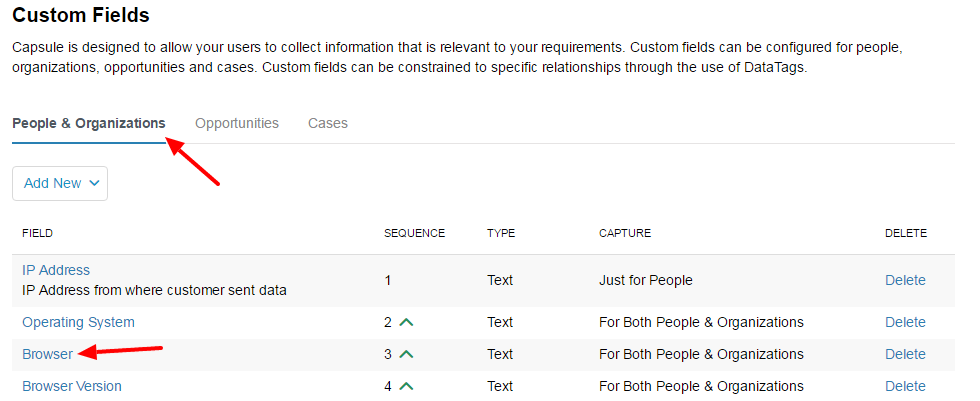 Ninja Forms’ Capsule extension lets you add custom fields to People / Organizations, and Opportunities. You can see the available custom fields in your Capsule account settings, as shown in this screenshot. You can see the particular module and the name of a custom field by the two arrows.