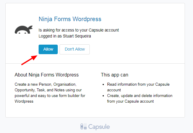 After logging in, you will be asked to Allow Ninja Forms to view and write data related to your Capsule account. Click Allow