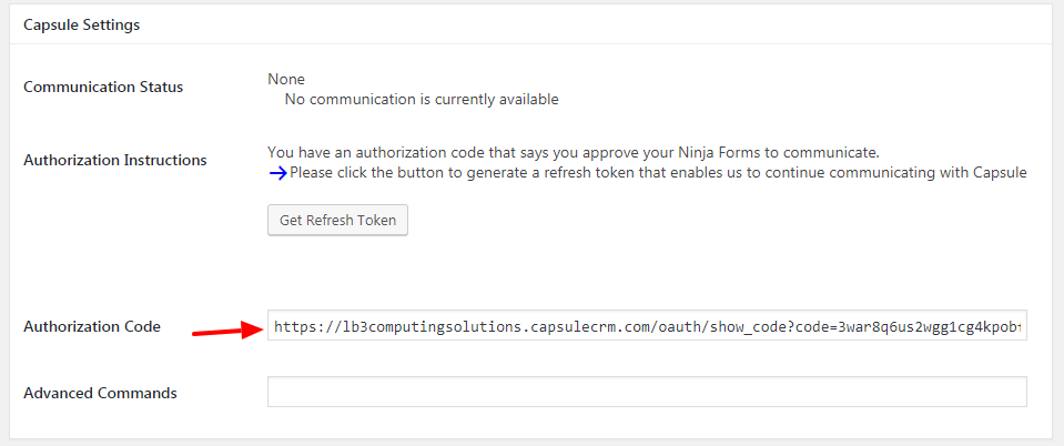 After saving your options, click on the button “Get Refresh Token.” This refresh token is a renewable version of authorization that will allow your Ninja Forms Capsule extension to continue to send form data on your behalf to your Capsule account.