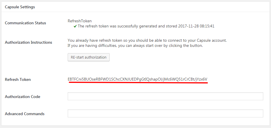 Note that a new setting, Refresh Token appears in the Capsule settings to show that you now have access and are ready to connect your forms.