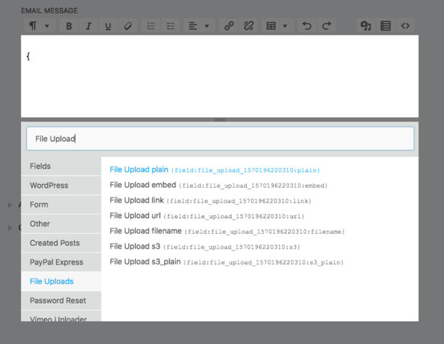 2. Add in the File Uploads merge tag to the Email Message body by simply clicking on it. Should your list show many merge tags, and you have trouble locating the correct tag, take advantage of the merge tag search bar and type File Uploads to locate the appropriate tag.
