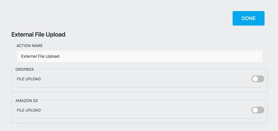 Now that you have your plugin configured to send to either Dropbox or Amazon S3 (step 1), you need to add and configure an External File Upload action on the form itself. Open your form and navigate to the Emails & Actions tab, then click the blue circle/+ in the bottom right corner to add a new action.