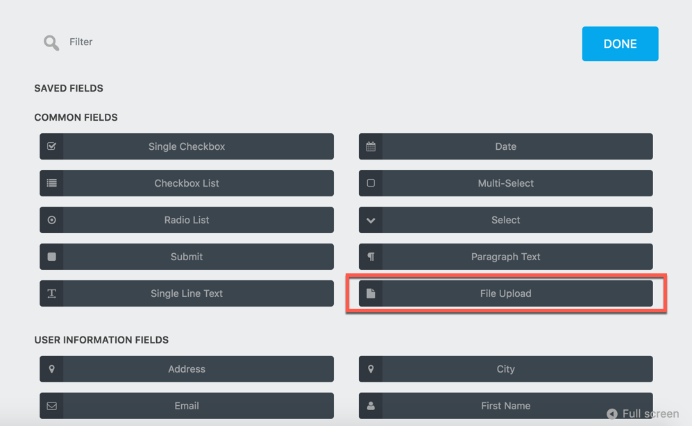 A File Uploads field can be added to the form by clicking on the Add Field Button on the bottom right, then choosing the File Upload field from the list.