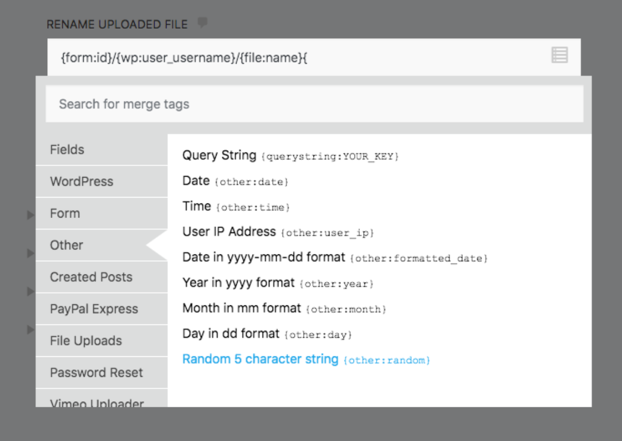 If you want the file to retain the name your user gave it, leave this blank. If you prefer your own naming convention, you can enter it here using the merge tag button.
