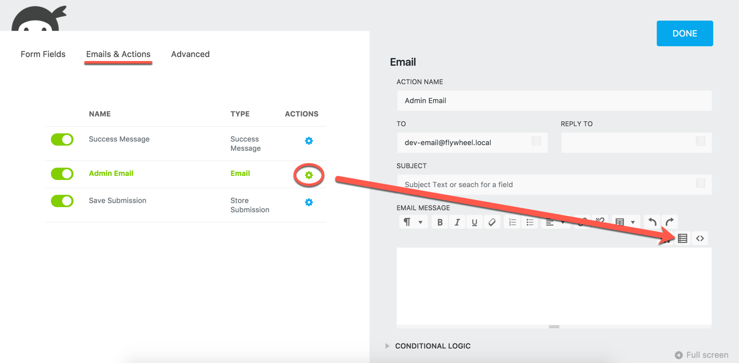 - From the Emails and Actions tab, edit the email action by clicking on the action’s gear symbol. From here, click the merge tag button located in the Email Message line, shown below.