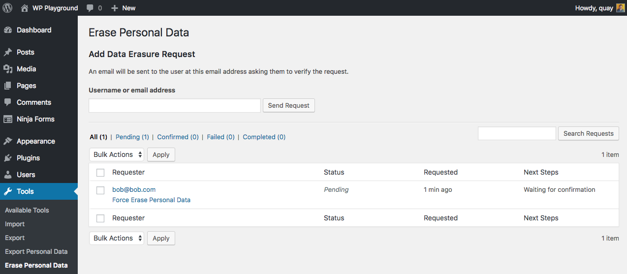 When a user submits the Delete Data Request form or any form containing the action, that request will be viewable in your WordPress dashboard under Tools > Erase Personal Data.