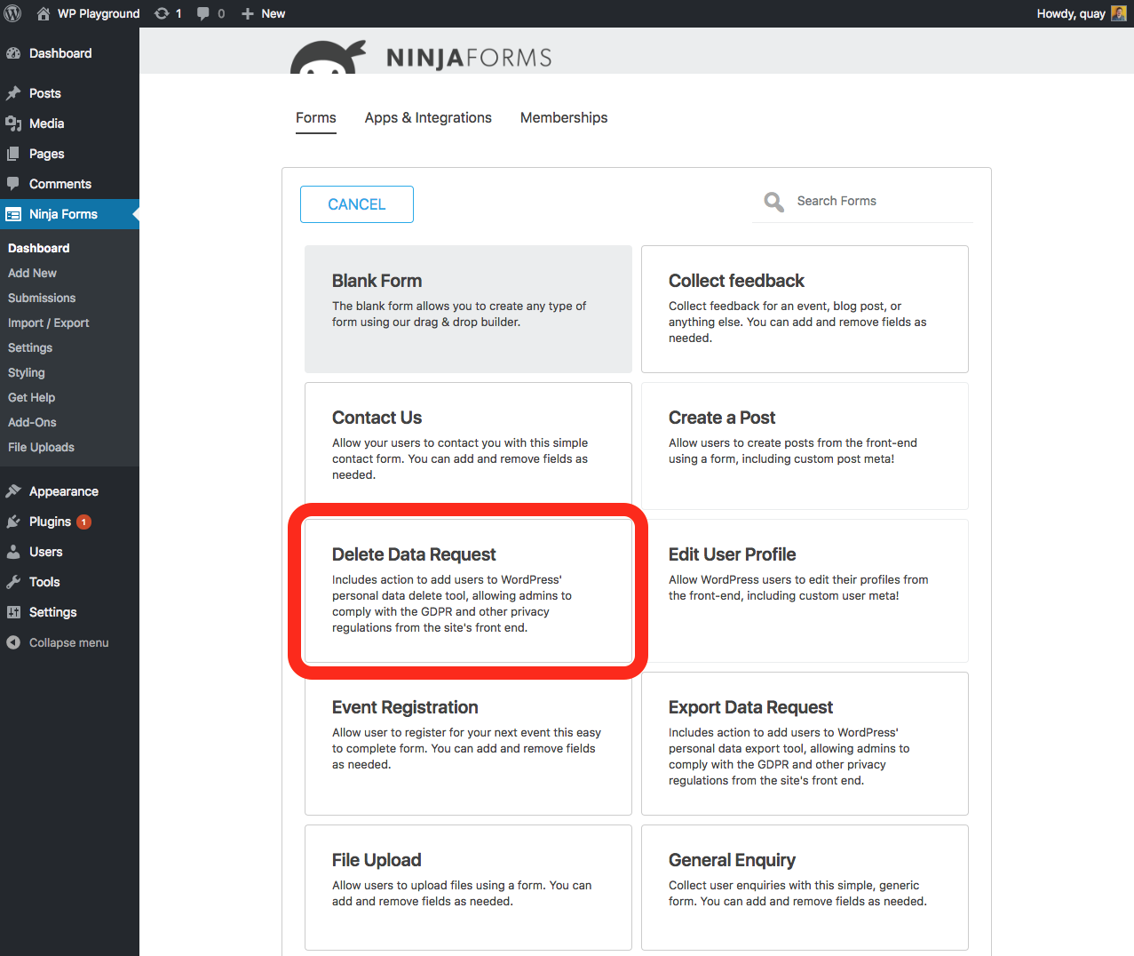 There is a stock form template, Delete Data Request, that can be placed on any page of your website. It can be found under Ninja Forms > Add New
