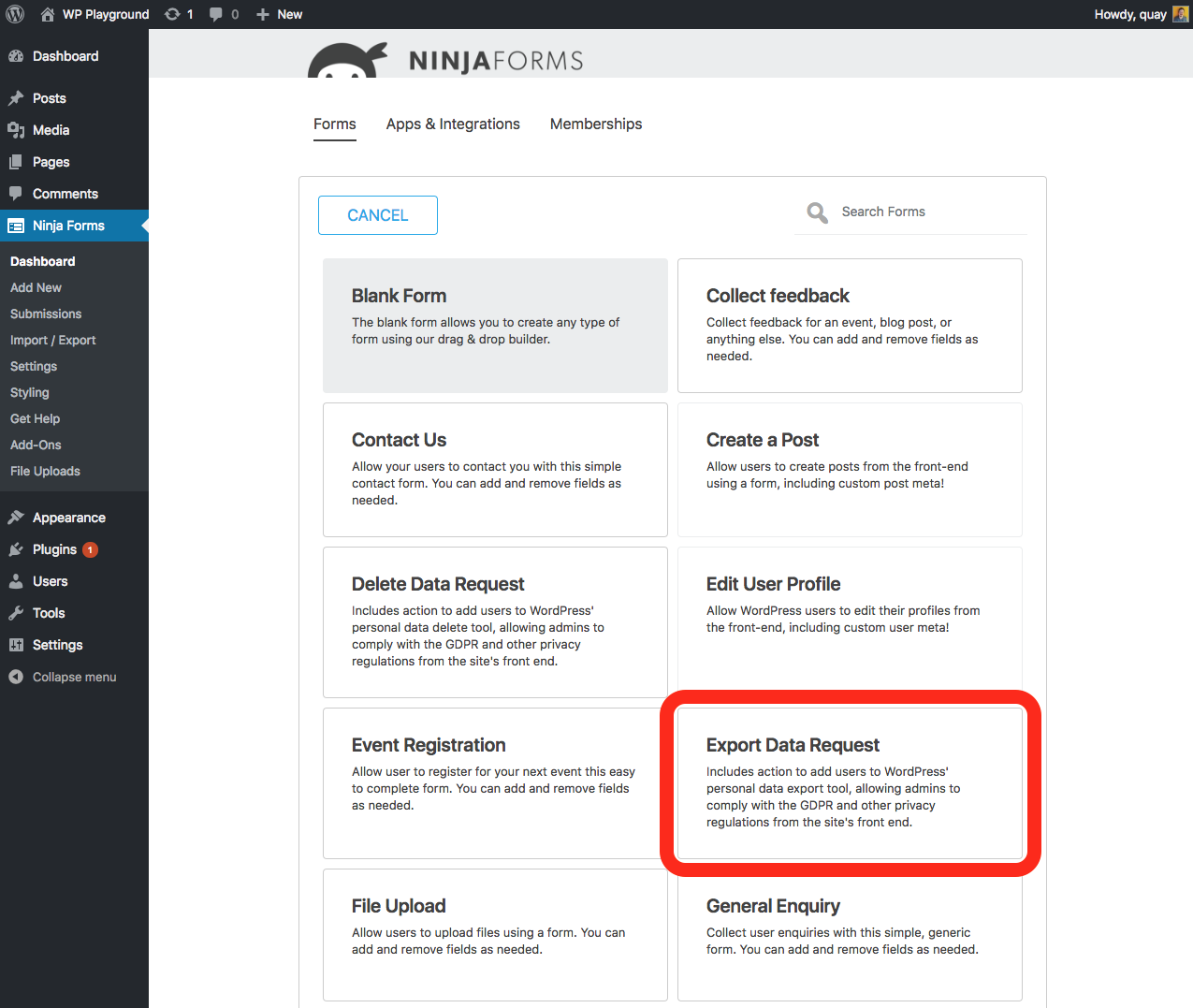 There is a stock form template, Export Data Request, that can be placed on any page of your website. It can be found under Ninja Forms > Add New: