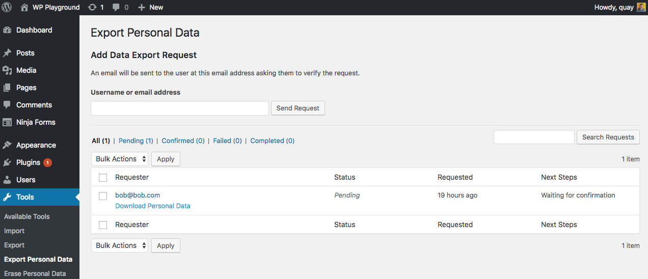 When a user submits the Export Data Request form or any form containing the action, that request will be viewable in your WordPress dashboard under Tools > Export Personal Data.