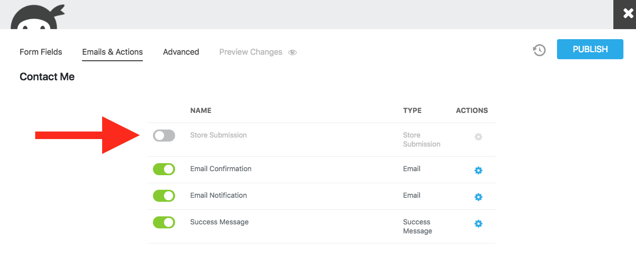 To turn data storage off completely for a form, navigate to the Emails & Actions tab of the form, and toggle off the Store Submission Action (grey):