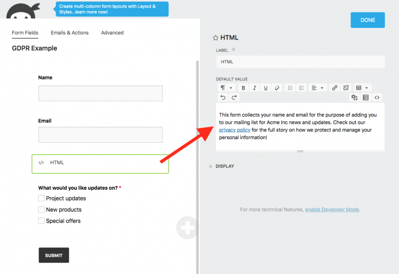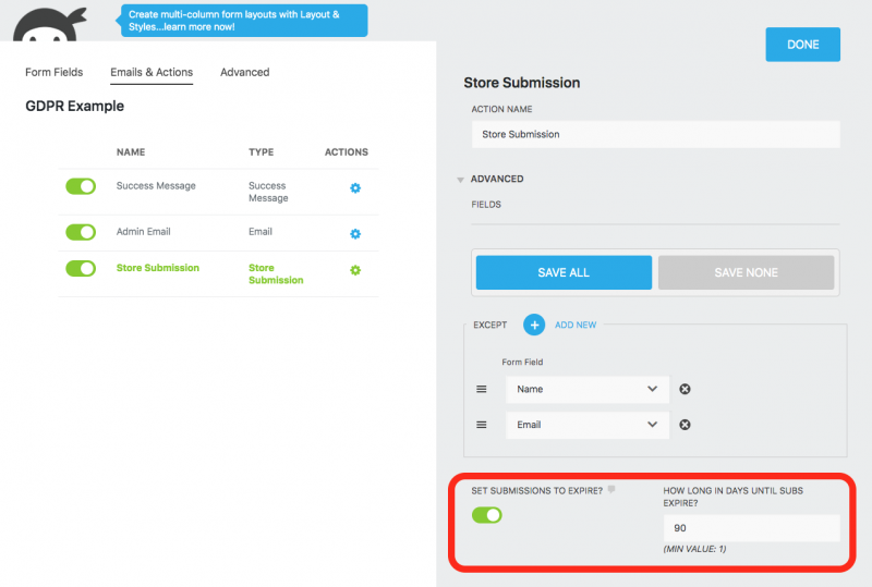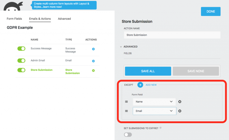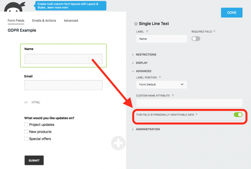 Ninja Forms offers a variety of features that will help make GDPR compliance easier with your WordPress forms. Specifically, these features will help you: