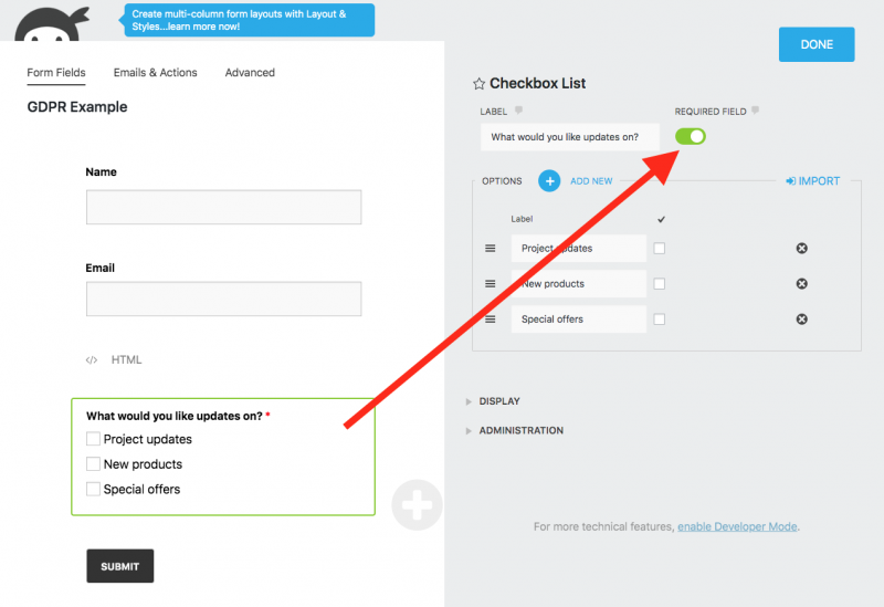 Single Checkbox and Checkbox List fields are the clearest way to confirm explicit consent. Setting them to Required means a user cannot submit the form unless consent has been granted: