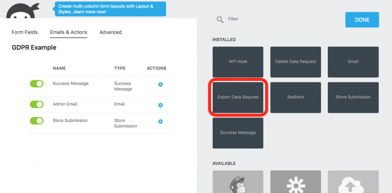 There is also a Export Data Request action that can be added to any of your WordPress forms: