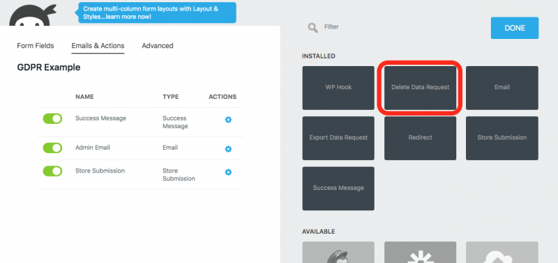 There is also a Delete Data Request action that can be added to any of your WordPress forms: