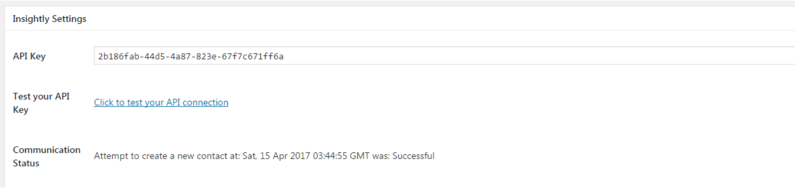 Here is an example of how your Insightly Settings will look with your API Key entered and actively communicating with your Insightly account.