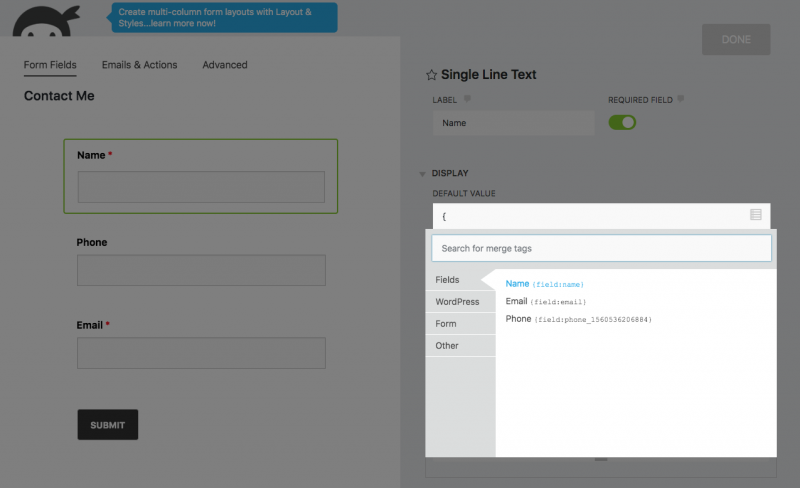 Merge tags are a feature of Ninja Forms that allows data to be pulled from different sources within WordPress and populated in the location that the merge tag is placed. They can be used to pre-populate fields with logged in user metadata, pass field data from one form to another, populate email messages with the name of the submitter, and much more.