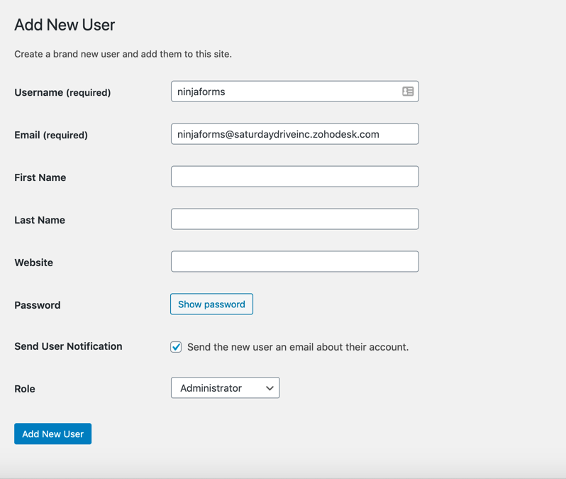The username and password will be passed to the support team or individual doing the work. The Role should be set to Administrator as pictured above. WordPress wants an email address, but it can be any of your choosing and does not need to be passed on.